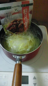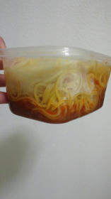 昨日の残りのミートソースです。タッパーに入れて保存していたので、そのまま麺をずどん。下からかきだして食べます。洗い物が減ります。